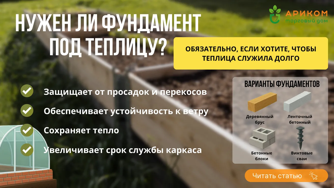Если планируете пользоваться теплицей больше пары сезонов — не экономьте на основании. Это инвестиция в долгий срок службы, вашу уверенность и урожай.