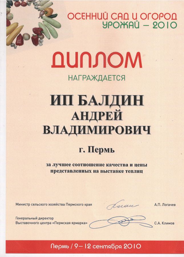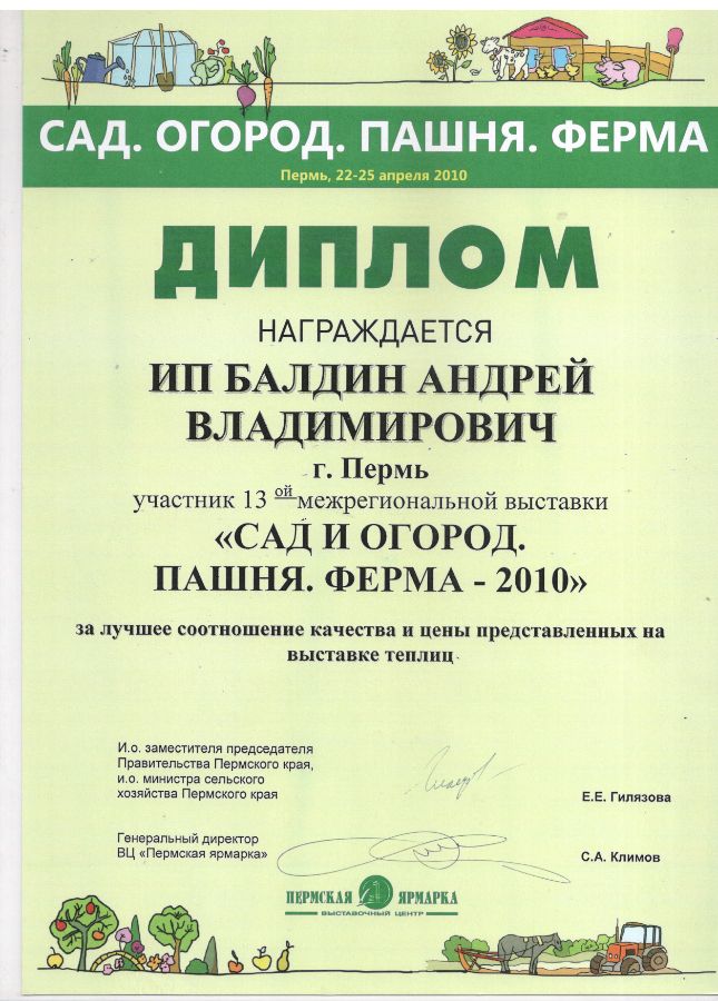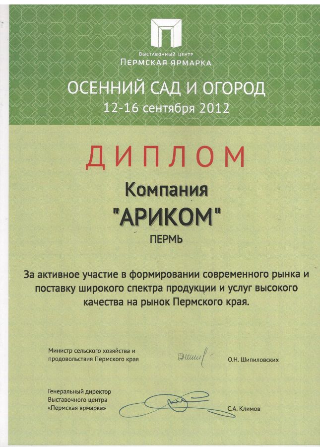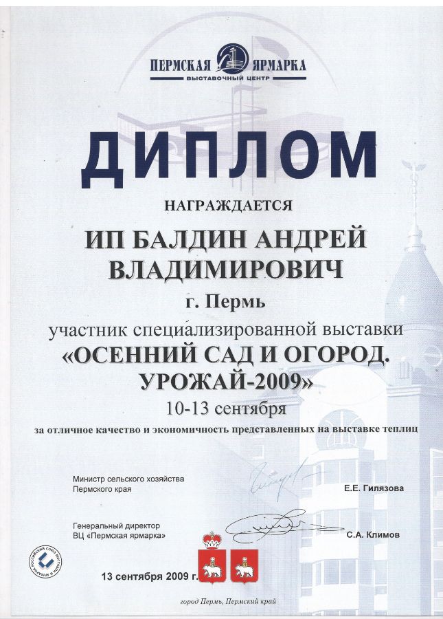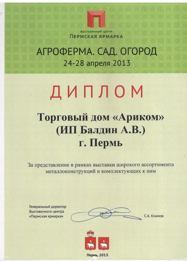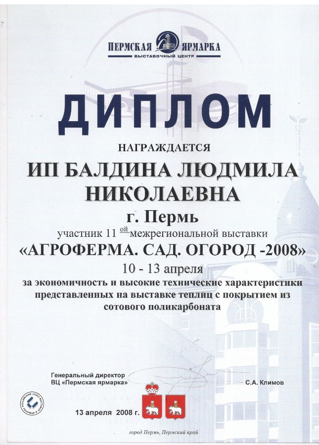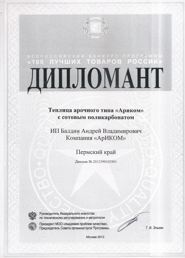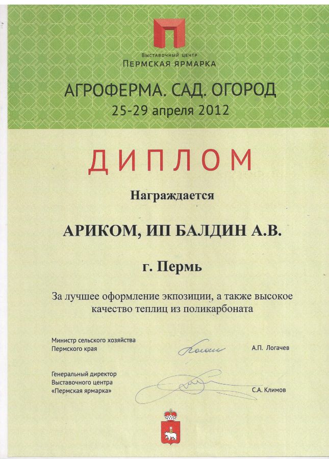 Компания "АрИКОМ" с 2001 г. является лидером реализации сотового и монолитного поликарбоната, теплиц, парников различных конструкций по г. Перми и всему Пермскому краю. За это время были учтены все пожелания наших клиентов, расширен ассортимент теплиц, их конструкция была доведена до максимального уровня удобства и качества! Наша продукция получает высшие награды!