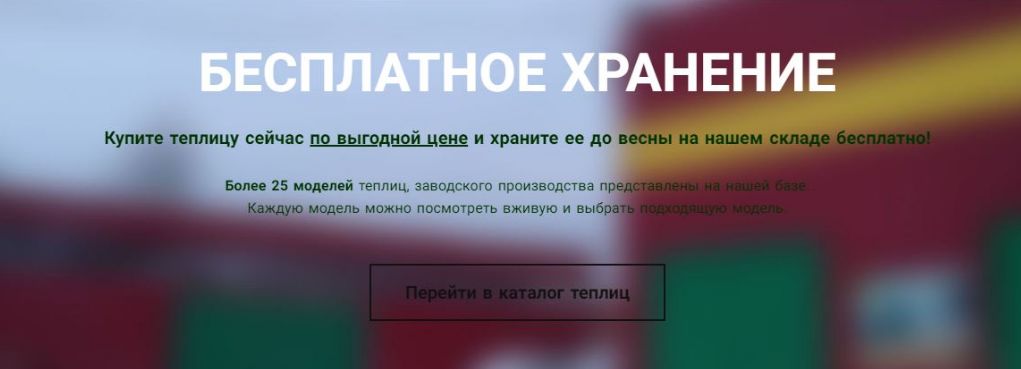 Купите теплицу сейчас по выгодной цене и храните ее до весны на нашем складе бесплатно! Более 25 моделей теплиц, заводского производства представлены на нашей базе. Каждую модель можно посмотреть вживую и выбрать подходящую модель. Бесплатное хранение,Выгодно Поделиться