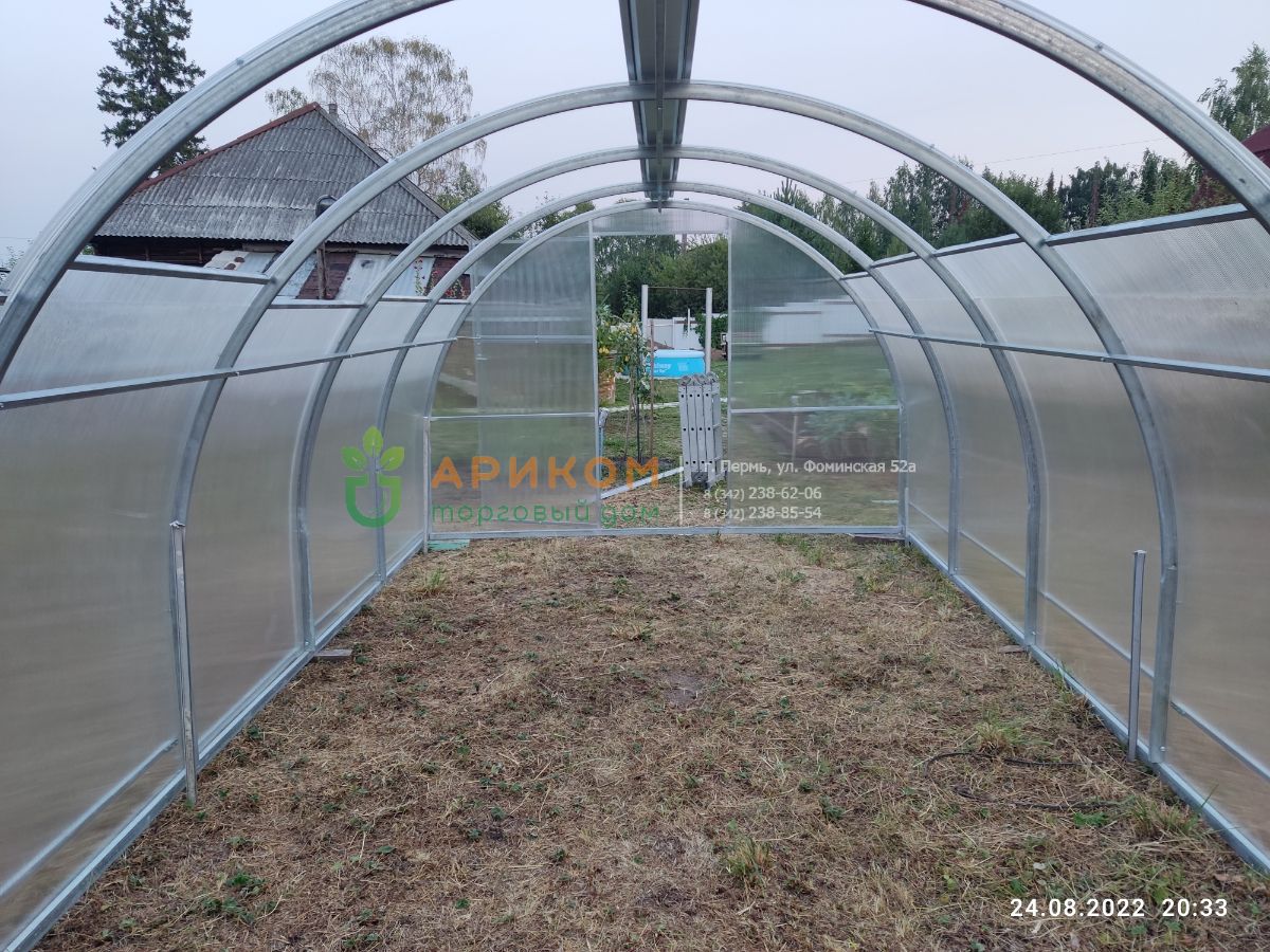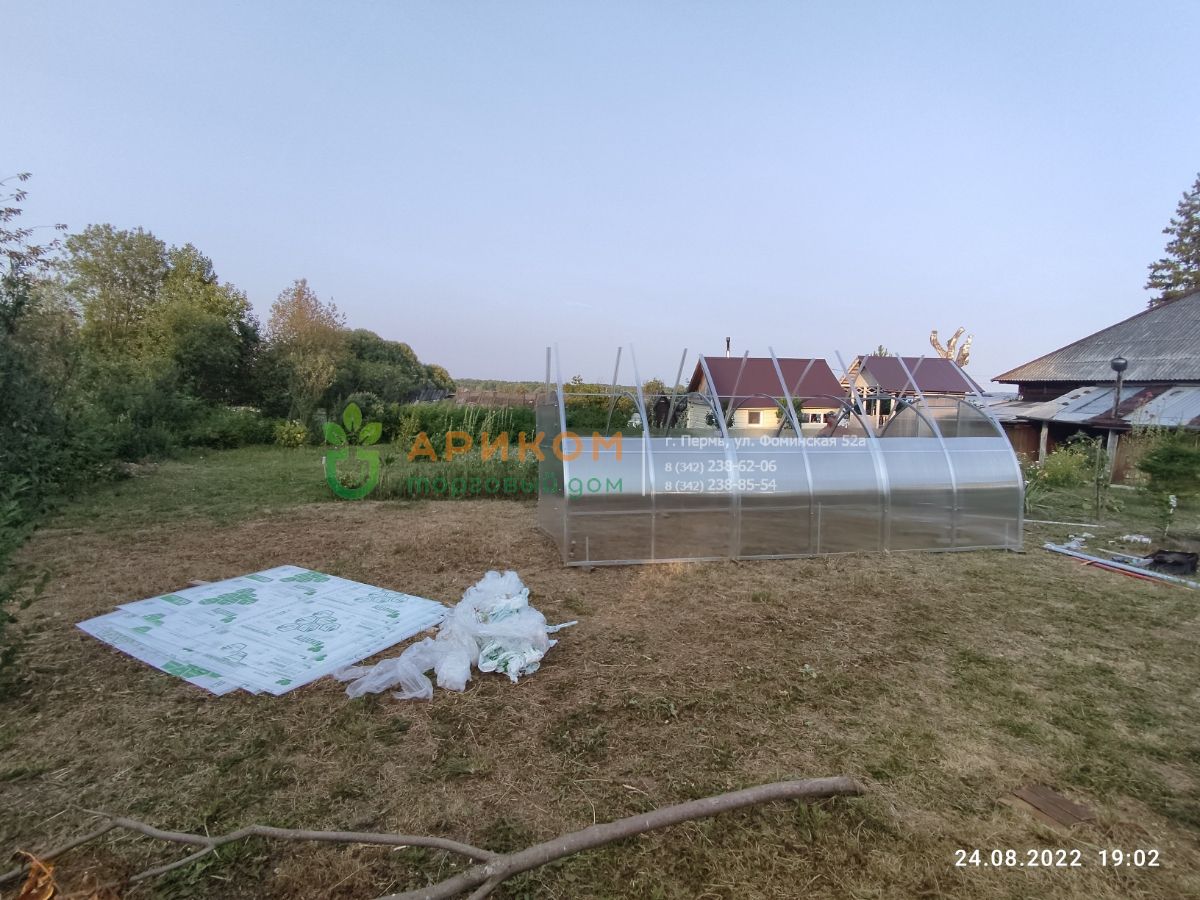 Сборка осуществлена рядом с бассейном. После подготовки основания возле бассейна, теплицу в собранном виде перенесут в проектное положение.