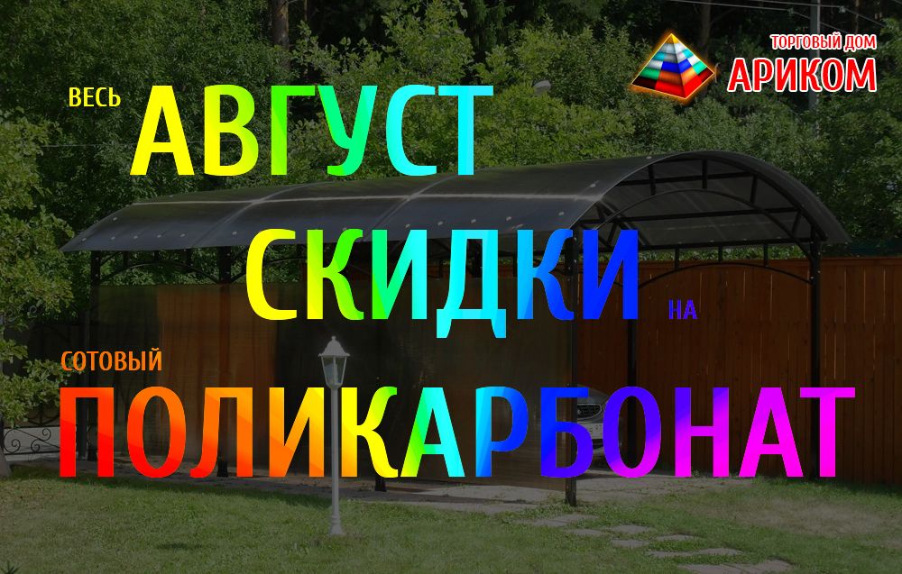 Уважаемые клиенты!Успевайте воспользоваться отличной возможностью - приобрести сотовый поликарбонат - Цветной и бесцветный, по очень выгодным ценам! Учтите, что количество товара ограничено! С актуальными ценами Вы можете ознакомиться в прайсе: https://arikom.perm.ru/spk-price Акция,Сотовый поликарбонат,Август Поделиться
